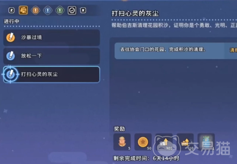 其二为商会委托任务:每日商会发布的常规任务中,固定包含一项“清理花园沙堆”任务。接取后,系统将自动标记商会入口旁的指定花园区域,该处会生成若干堆待清理沙砾。玩家需携带鸡毛掸子前往,连续执行清扫动作数次,即可完成沙粒清除目标,成功提交任务后获得金币、经验值及协会贡献值奖励。