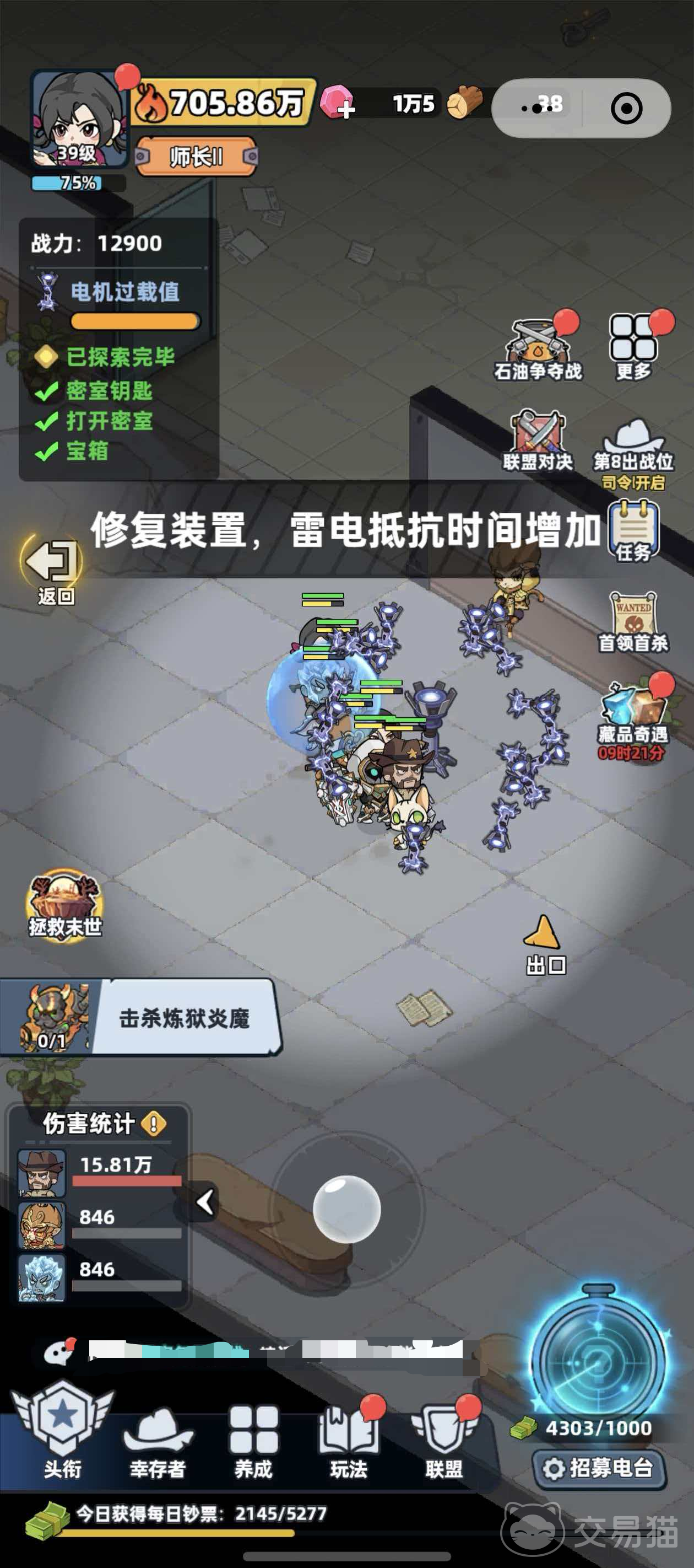 第二类为高压电路房间:除常规丧尸威胁外,还存在电压过载机制。界面左上角实时显示“电机过载值”,该数值随时间推移持续下降。当数值趋近于零时,必须立即前往房间内指定电机位置进行充能操作,否则将触发全场瘫痪效果,导致探索中断。此类房间无地图显性标记,数量稀少但收益显著——不仅宝箱内物品品质更高,且丧尸掉落钥匙概率大幅提升,部分精英单位甚至必定掉落钥匙。房间最终区域设有一处密室,仅能通过专用“密室钥匙”开启,内含稀有资源与特殊道具。