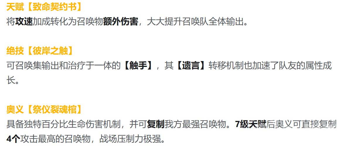丝碧莫并非传统意义上的输出型角色,而是以攻速为枢纽的战术中枢:其天赋机制可将自身攻击速度直接转化为召唤物的基础伤害,从根本上突破召唤流派中后期输出疲软的瓶颈。她的绝技“深海触手”兼具范围伤害与团队治疗效果;更关键的是“遗言转移”机制——当召唤单位阵亡时,其部分属性将永久叠加至存活队友身上,实现战损即增益的正向循环。而七级天赋解锁的核心奥义,允许她在瞬息之间复制出四个高阶召唤单位,彻底改写战场兵力结构。