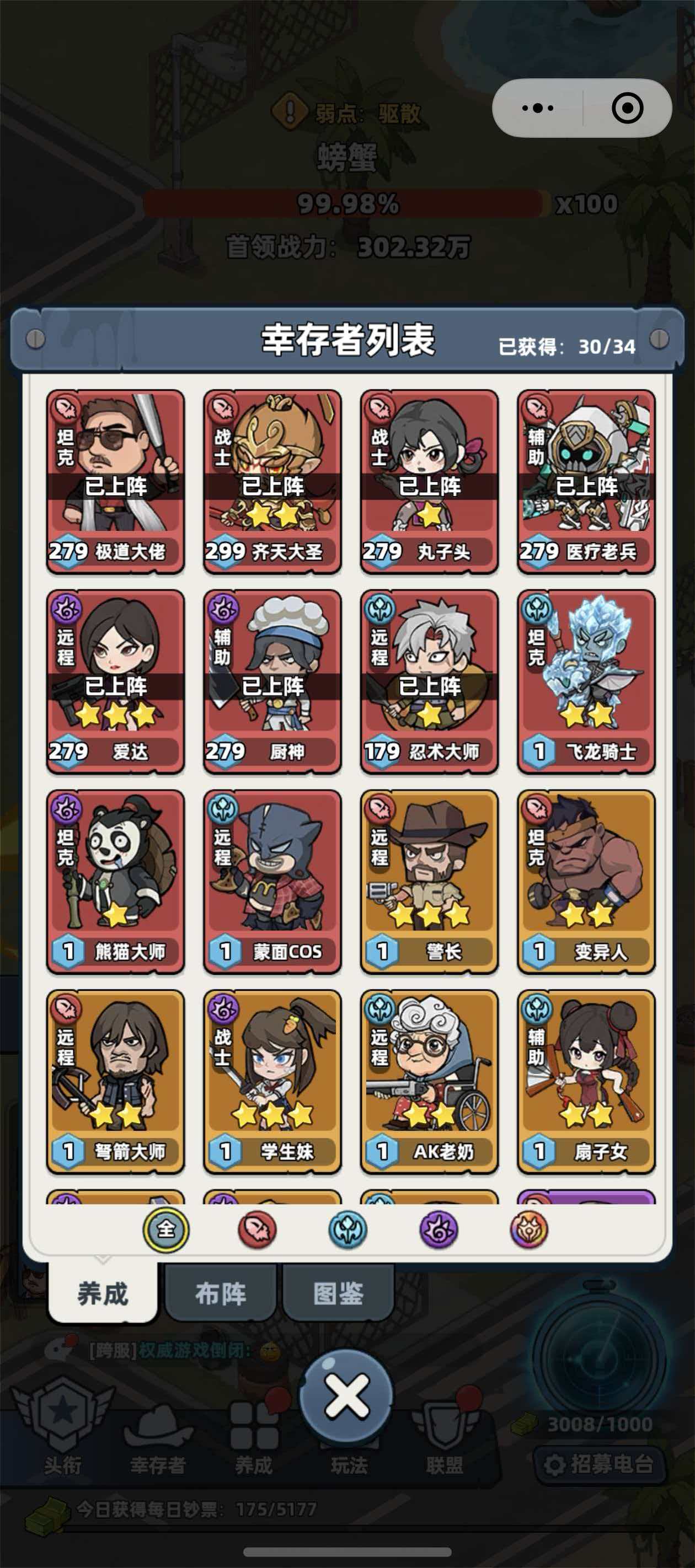 其次需精准应对弱点机制。每次遭遇螃蟹Boss时,其血条上方会动态显示当次战斗的专属弱点标识——可能是“净化抗性”“元素克制”或“技能书类型限制”。玩家须依据实时提示,配置对应属性的角色(如具备净化效果的辅助型幸存者)或携带指定名称的技能书(如“破甲符文卷轴”“腐蚀增幅典籍”等),否则无法触发有效破甲。此外,阵容搭配应侧重高倍率爆发输出,推荐选用齐天大圣、爱达等单体伤害系数突出的角色;同时必须编入具备吸血或持续治疗能力的支援角色,以保障长时间战斗中的生存续航。