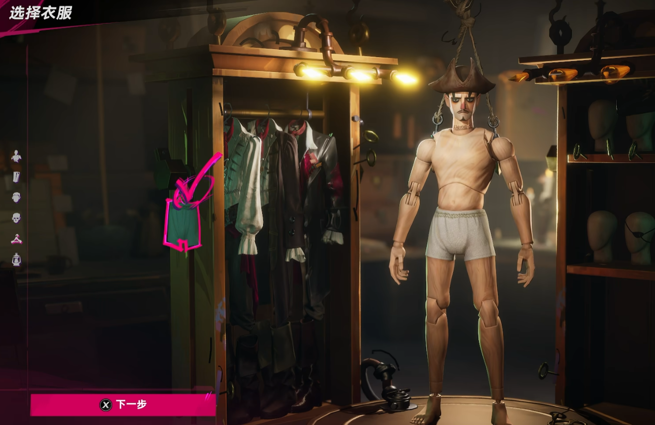 若希望零成本定制初始形象,可在角色创建阶段完成全部外观设定。完成捏脸后,系统将开放衣柜界面,支持自由搭配上装、下装、配饰等部件。例如选择复古海盗风格套装,或简约白衬衫搭配工装裤;甚至可组合出极具反差感的造型,如仅保留基础内裤并叠加木偶质感皮肤,实现高度个性化的视觉表达。