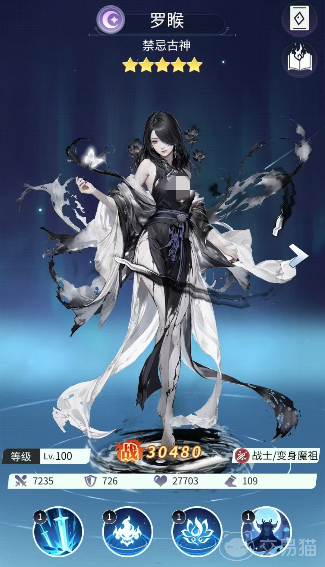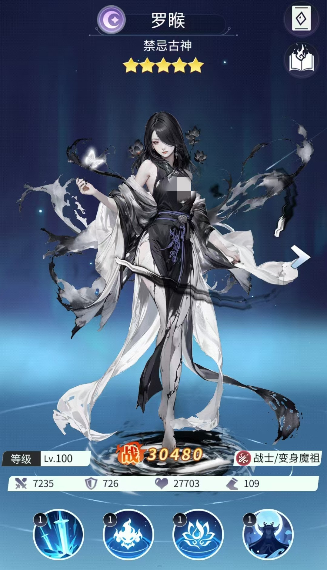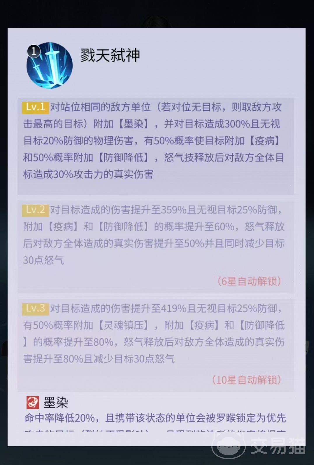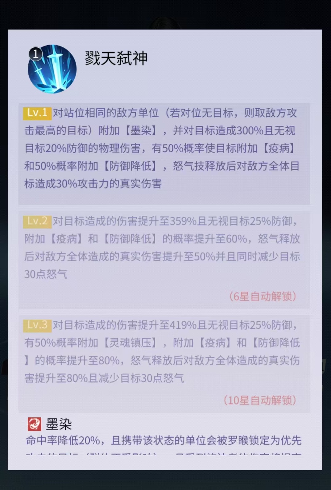 罗睺的一技能具备精准压制能力:对同排敌方单位施加「墨染」状态,造成高额伤害并无视部分防御;该效果附带概率性疫病与防御削减,并显著降低目标命中率,同时使其成为罗睺后续攻击的优先锁定对象。当怒气值满时释放的怒气技,可对敌方全体造成一次真实伤害,进一步强化其战场控制力。