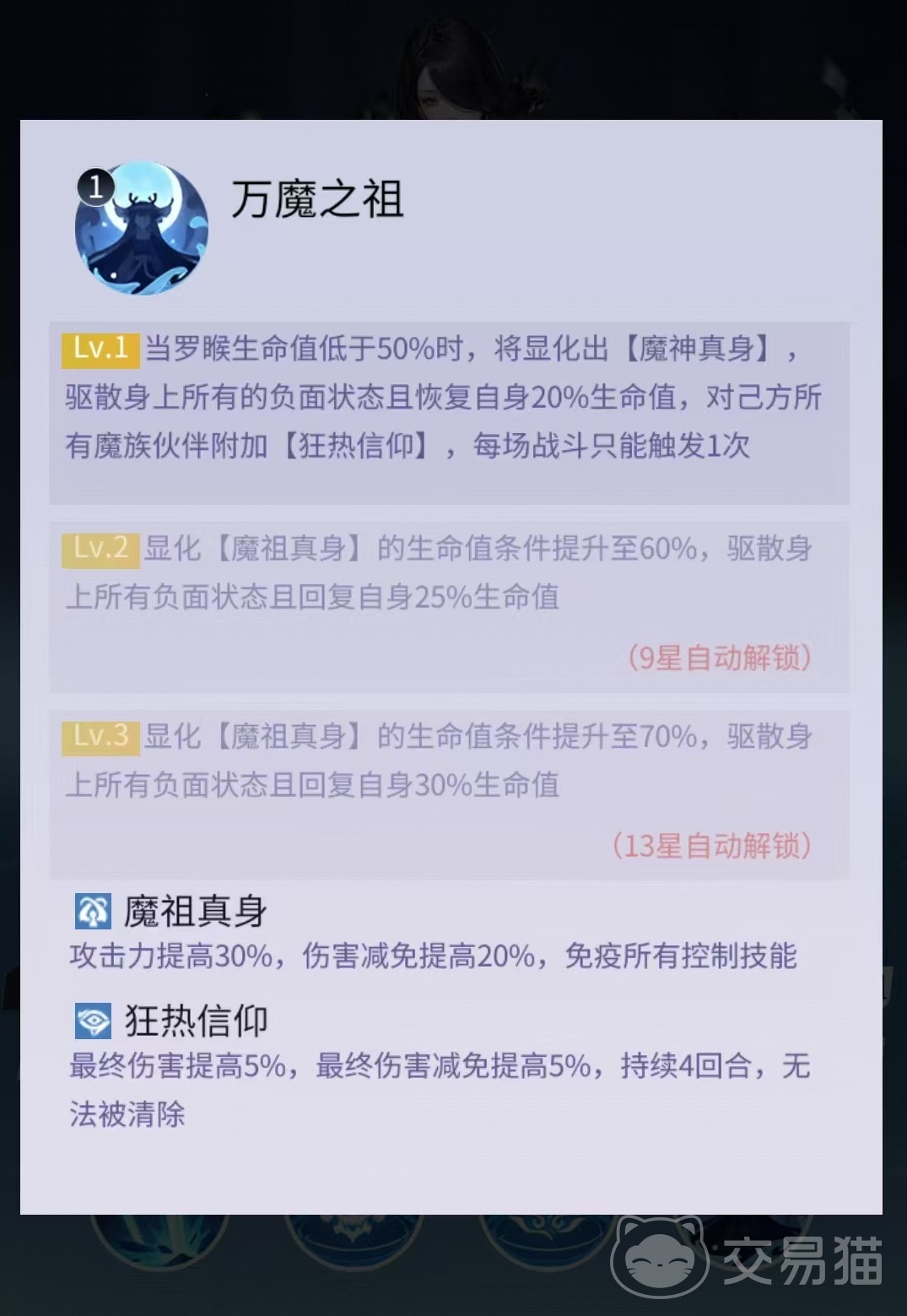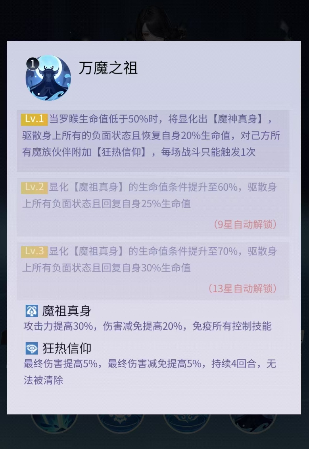 其终极技能(大招)设定为半血触发机制:生命值低于50%时自动激活魔神真身,立即清除自身所有负面状态,并恢复一定比例生命值;与此同时,所有魔族队友将获得「狂热信仰」增益,提升最终伤害输出。这一机制不仅大幅强化罗睺自身的生存韧性,更使其成为团队爆发链的核心枢纽。