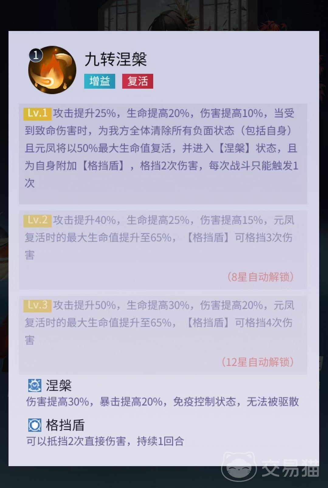 被动技能提供基础属性成长(攻击、生命、伤害加成),并赋予关键生存机制:当元凤承受致命伤害时,触发自动复活,并为我方全体清除所有负面状态。这一设计极大提升了队伍容错率,尤其适用于高难度副本与PVP对抗中的关键翻盘节点。