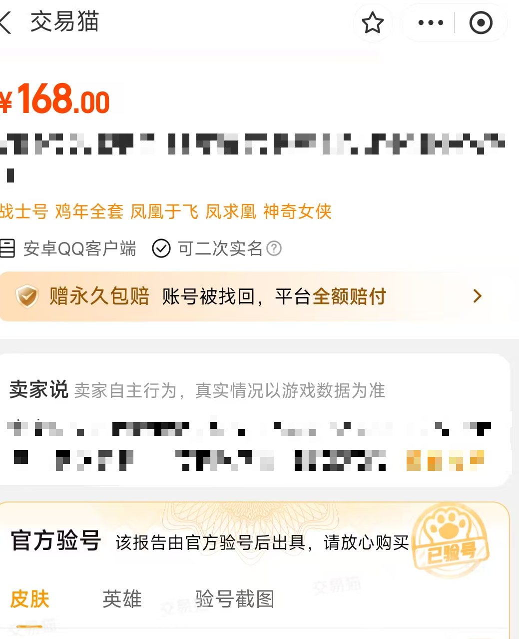王者荣耀出售的平台有很多,但是每个平台的服务保护肯定是不一样的,而交易猫平台的安全保护是很到位的,平台会赠送安心购的服务权益,只要玩家们的账号出现特殊情况丢失的话,那么官方这边都会进行相应地赔付,保障玩家们的权益得到保证,而且这里是真正的游戏爱好者天堂!6000 余款热门游戏全面覆盖,同时平台上 100 万 + 在架游戏商品琳琅满目,账号、道具、礼包应有尽有,累计已为 7000 万 + 玩家提供安心服务,让每一份游戏热爱都能找到归宿,要想使用的话安卓用户只需要通过上方通过按钮下载,ios用户可以到交易猫官网使用哦。