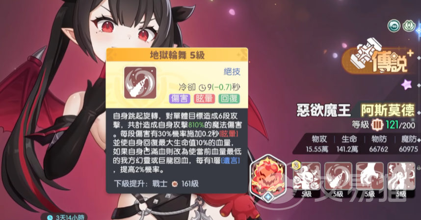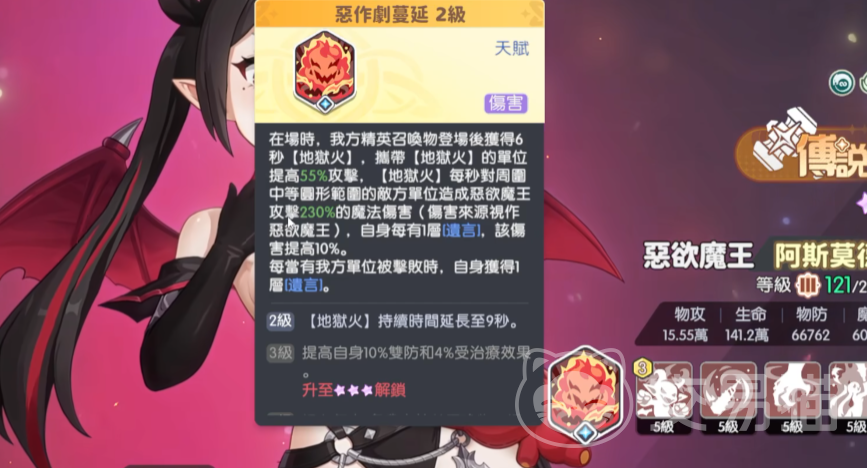 阿斯莫德共拥有六项关键技能:恶作剧蔓延(天赋)、恶魔援军(奥义)、地狱轮舞(主动)、血之渴望(秘技)、魔王律令(特殊)以及临别礼物(神格觉醒)。其中,“恶作剧蔓延”可为我方精英召唤物施加地狱火状态,使其攻击力提升50%,并附加等同于210%魔法伤害的持续灼烧效果,伤害归属者为阿斯莫德本人。