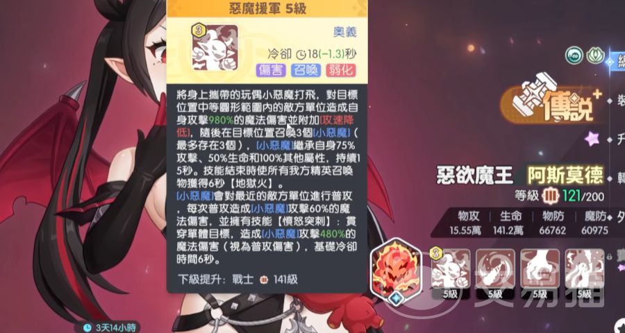 特殊技能“魔王律令”需消耗自身40%当前生命值,释放后可为阿斯莫德及我方所有恶属性召唤物各自生成相当于最大生命值37%的护盾,并同步提升召唤物的攻击与攻速;神格觉醒技“临别礼物”则与“恶魔援军”联动生效,在使用奥义时额外对目标造成400%魔法伤害,并削弱其魔法防御力。