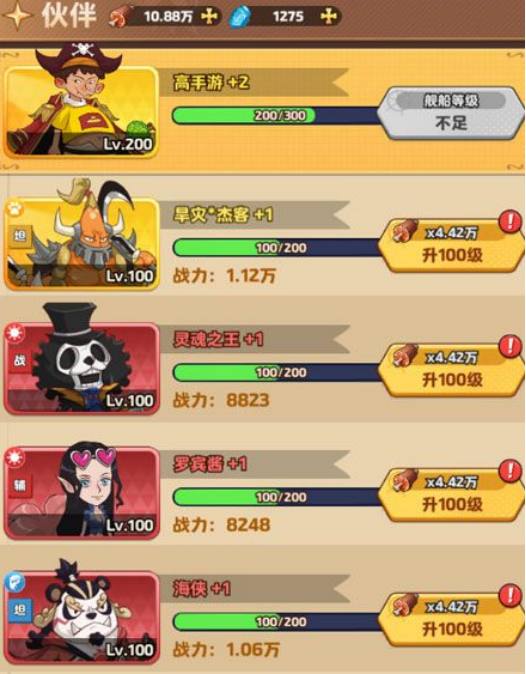 伙伴成长体系围绕“船长等级—伙伴上限—进阶突破”三层结构展开:伙伴等级上限直接受限于船长当前等级;当船长达到100级或200级时,需消耗钻石进行进阶,方可解锁更高阶培养路径与战力跃升。配套传信系统支持跨服互动,强化角色羁绊与团队协同深度。