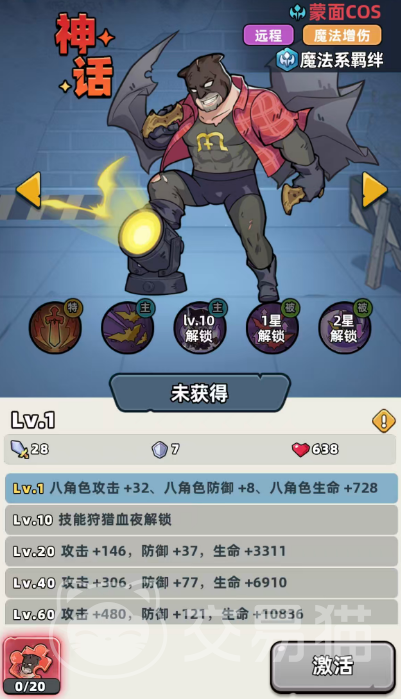 蒙面COS:前期远程压制与自保型法师代表。技能可召唤蝙蝠攻击3个目标,造成60%魔法伤害;入场即部署3只小蝙蝠,分别跟随蒙面COS本人及队伍中攻击最高的两名队友;小蝙蝠自动锁定目标并发动撕咬,每次造成20%魔法伤害;终极技能激活后,每位角色所跟随的1只小蝙蝠升格为「吸血小蝙蝠」,撕咬伤害提升至原值2倍,并附加2秒眩晕控制效果。