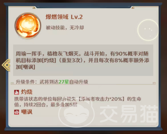 另一被动“爆燃领域”于战斗初始即激活,以90%高概率对随机敌方单位施加灼烧,且整场战斗中最多可重复触发3次,大幅提高群体灼烧覆盖率。每次成功施加灼烧后,还有8%概率额外附加1层嘲讽。多重状态叠加下,周瑜可快速构建灼烧—嘲讽—暴击—持续伤害的正向循环,显著提升团队整体作战效能。