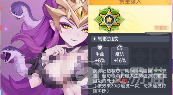 赏金猎人:专为美杜莎角色优化设计,提供8%生命值增幅与16%魔法防御加成。其核心技能可在每30秒激活一次狂热状态,使攻击速度提升160%,同时进入恒定沉默效果。该转职高度契合美杜莎依赖普攻叠加印记、以频率驱动输出的战斗逻辑,大幅提升标记覆盖率与单位时间内的技能触发密度。