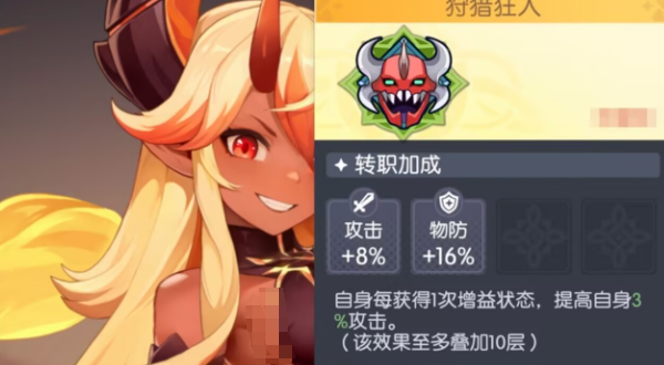 狩猎狂人:提供16%攻击力与8%物理防御,其核心机制为增益联动——每次获得任意增益状态,即可叠加3%攻击力,最高可叠至10层,达成30%总攻击力提升。该转职对角色获取增益的效率要求极高,若角色缺乏快速叠层手段或增益覆盖率不足,则实际收益将大幅缩水,需结合具体技能循环与队伍辅助配置审慎评估。