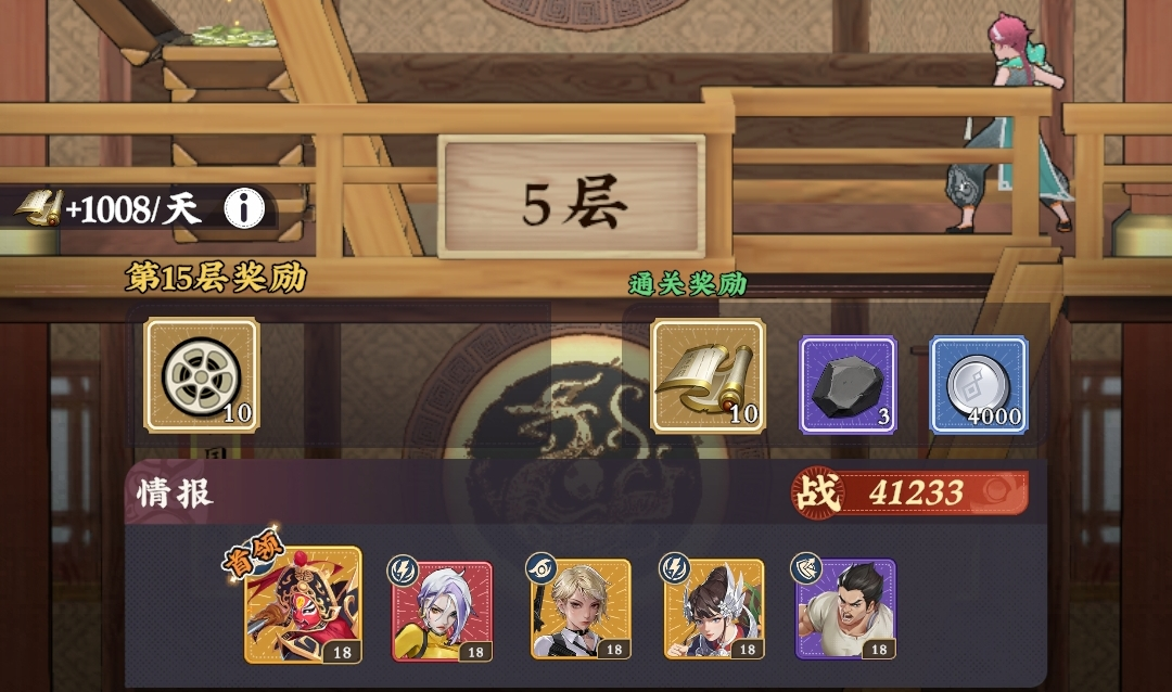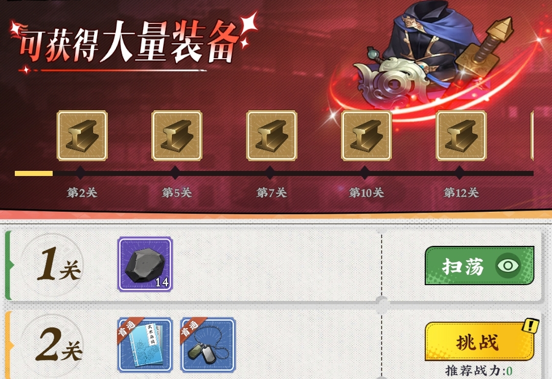 主线通关至第3-8关后解锁。该玩法采用逐层递进机制,层数越高,奖励越丰厚,同时可显著提升挂机产出中的【心得】数量。部分关卡设有额外宝箱奖励。首日目标建议达成30层以上。