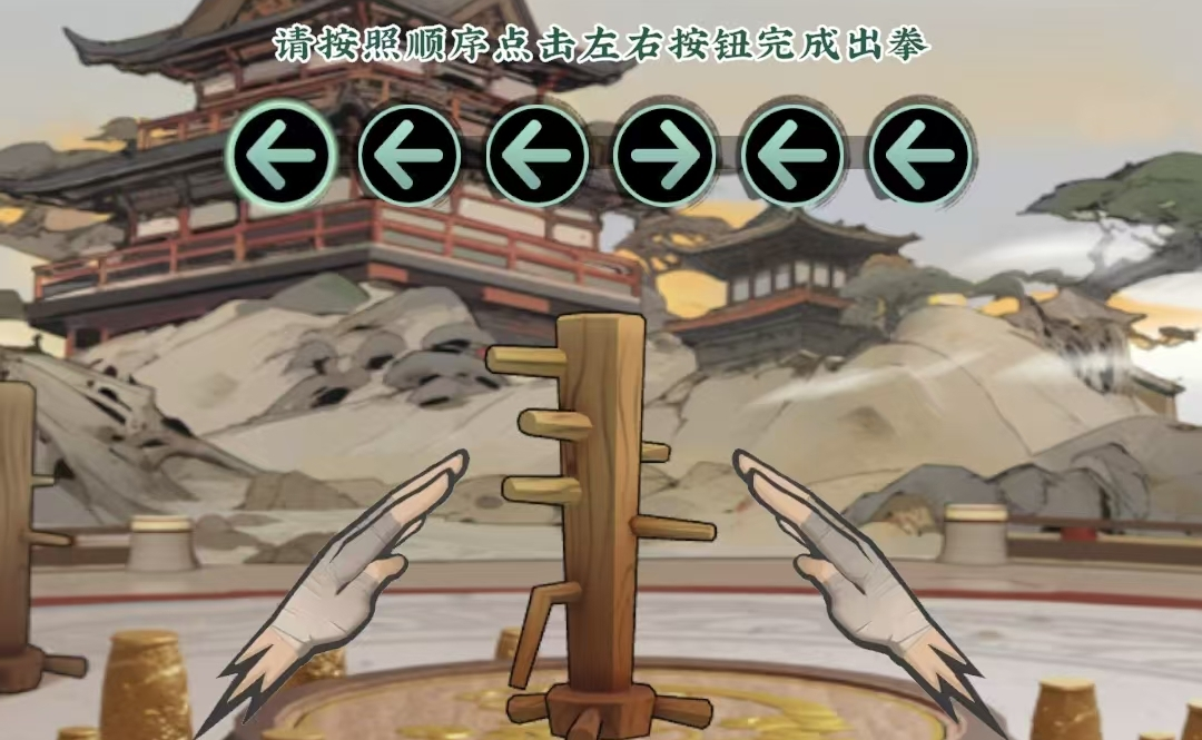 主线通关至第3-2关后开启,入口为玩法界面→日常。通过选择不同方向击打木桩完成挑战,可稳定获取【银元】、【英雄经验】与【武魂】。每日限参与两次,推荐优先挑战高难度档位。