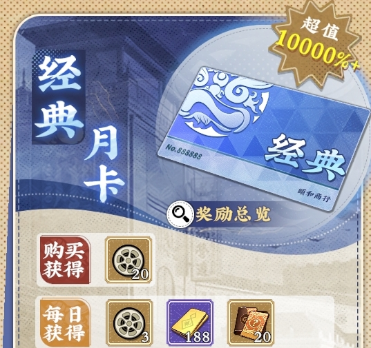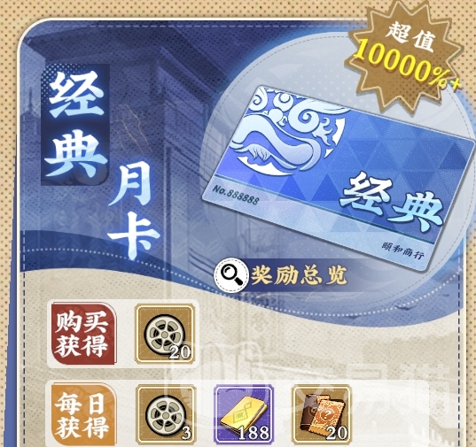 经典月卡定价30元,开通即赠20【普通胶片盘】;后续每日稳定发放3【普通胶片盘】、188【金砖】与20【英杰自选碎片】(100片合成1名英杰),并解锁百抽宗师招募特权。整个周期内总计可获得110【普通胶片盘】、5640【金砖】及600【英杰自选碎片】。