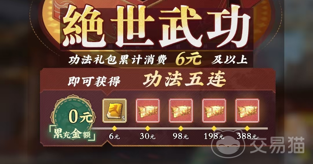 功法累充活动设五档达标奖励:6元、30元、98元、198元、388元。其中6元档可领取5张【秘籍残页】,其余各档均发放【红色功法随机箱】,属功法品质跃升的关键资源入口。