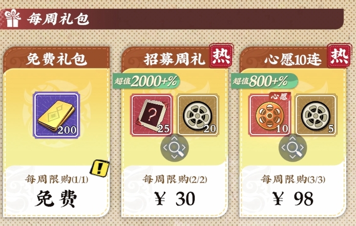每周礼包优先级排序为:30元【招募周礼】为首选;其次为98元【心愿十连礼包】;98元【功法周礼】与98元【丹药周礼】并列第三;其余类型暂不纳入常规购买计划。