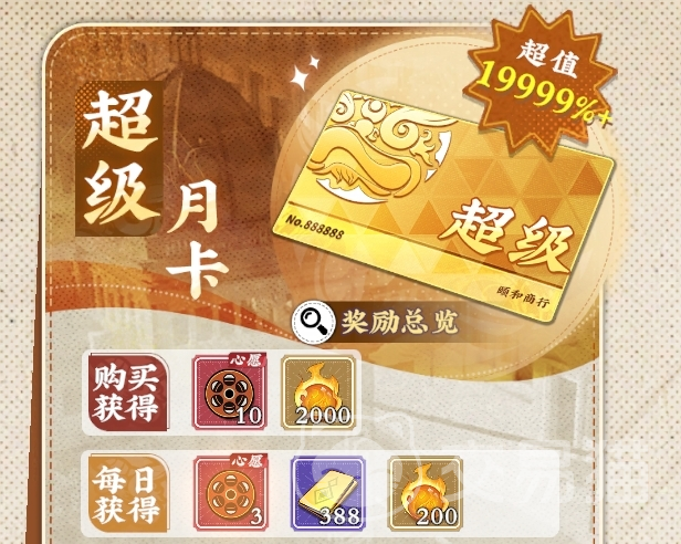 超级月卡售价68元,开通即得10【心愿胶片盘】;后续每日提供3【心愿胶片盘】、388【金砖】与200【武魂】(用于武将升阶),同时开放【每日金砖挂机次数+1】与【武道会助威奖励自动领取】两项功能。全周期累计可获100【心愿胶片盘】、11640【金砖】及8000【武魂】。