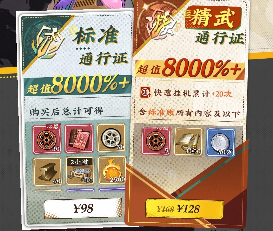 随机宗师英雄卡分为标准版(98元)与高级版(128元)。标准版含30【心愿胶片盘】、30【普通胶片盘】及【随机宗师英雄自选卡】;高级版在标准版全部内容基础上,额外赠送5【心愿胶片盘】、1000【心得】与50万【银元】,并解锁【快速挂机累计+20次】功能,综合价值更高,建议首选高级版本。