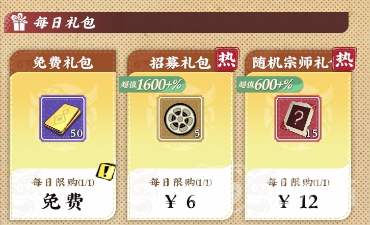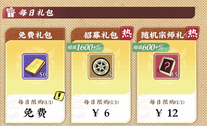 每日礼包推荐顺序为:6元【招募礼包】居首;其次为12元【随机宗师礼包】;再次为30元【心愿礼包】与30元【丹药礼包】(二者价值相当);其余选项暂不列入主力采购清单。