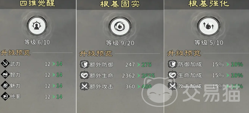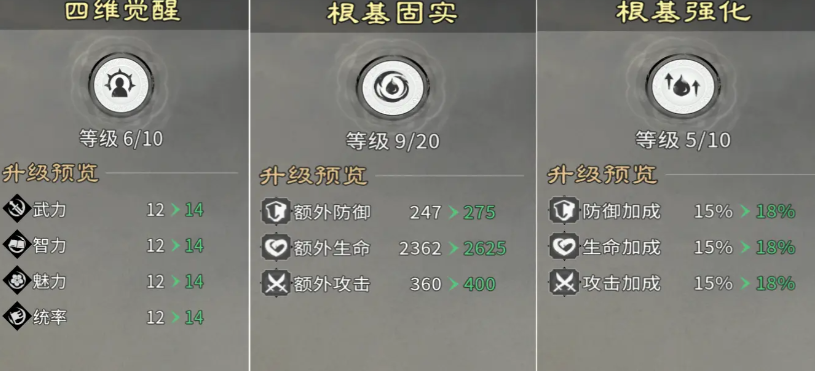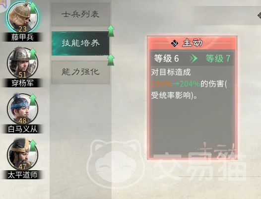 技能等级提升具备明确的数值反馈:相同数量训练心得投入下,战力增幅稳定可观。以穿杨军主动技能为例,从7级升至8级,伤害倍率由192%提升至204%;藤甲兵被动减伤效果亦随技能等级线性叠加。因此,主力兵种的技能必须第一时间拉满。待技能达到上限后,再转向能力强化模块。推荐优先解锁【思维觉醒】,该强化提供即时、显著的战力增益;随后选择【根基牢固】,每级固定增加防御值,资源投入产出比突出。