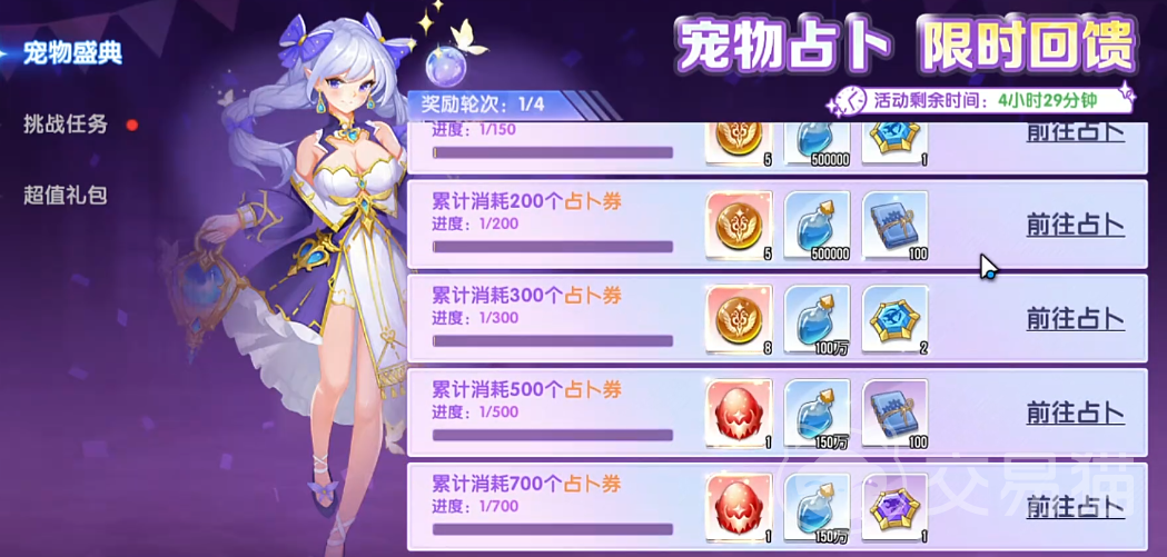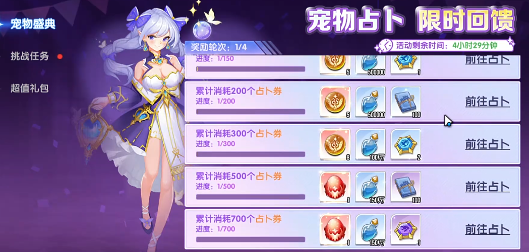 1、占卜系统——即游戏内主卡池抽取机制。玩家消耗占卜券参与随机抽取,每次抽取均存在固定概率触发UR宠物掉落,该方式为常规免费与付费玩家均可使用的通用渠道。