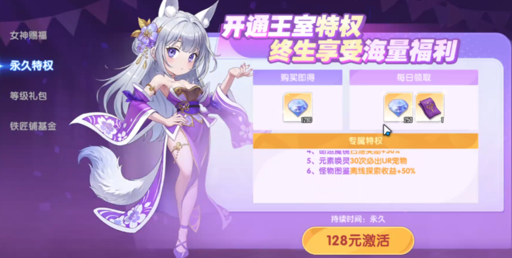 2、元素唤灵系统——独立于占卜池的进阶召唤玩法。基础出率低于占卜池,但开通终身会员(售价128元)后可激活“保底机制”:每累计30次唤灵必定获得一只UR宠物,显著提升获取确定性。