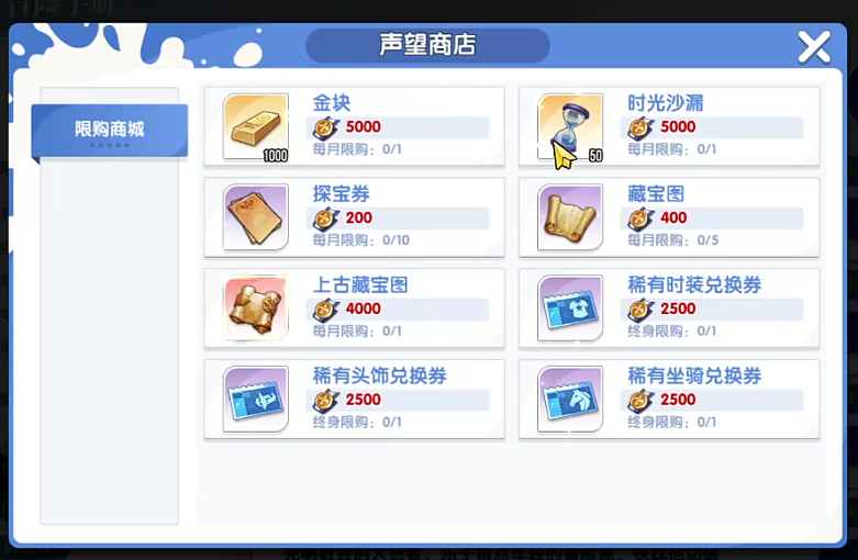 声望商店中最具战略价值的商品为三类终审限购道具:稀有头饰兑换券、稀有坐骑兑换券与时装兑换券,每种均限兑1次。全部获取需累计7500点声望值。相较之下,金块、时光沙漏、藏宝图等基础消耗型道具虽可随时兑换,但单位声望投入产出比偏低,不建议作为主力兑换目标。