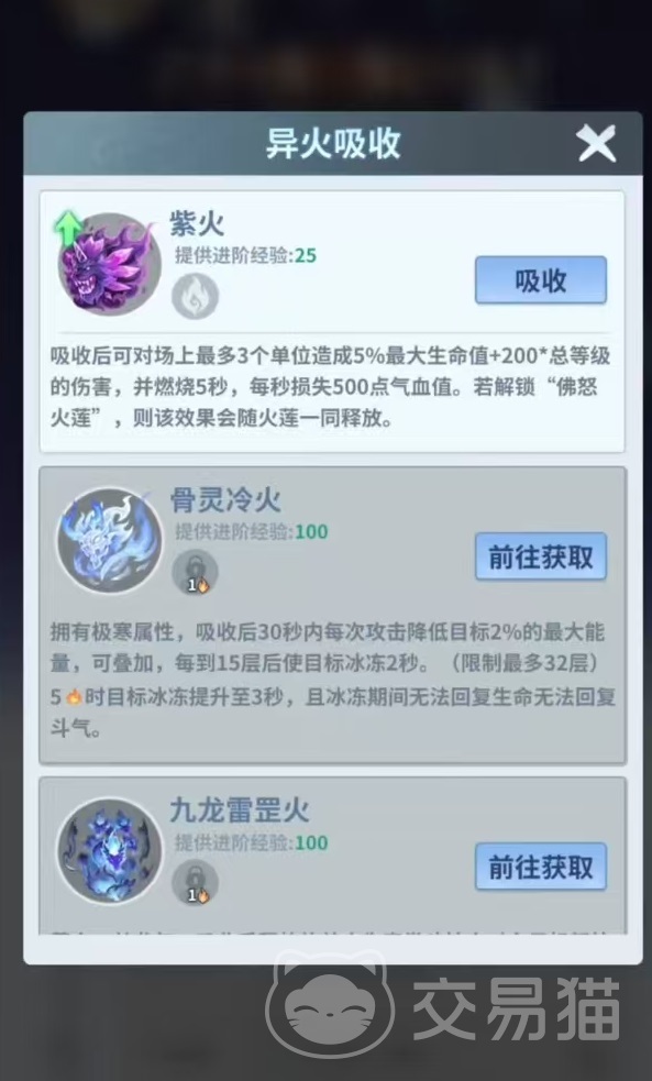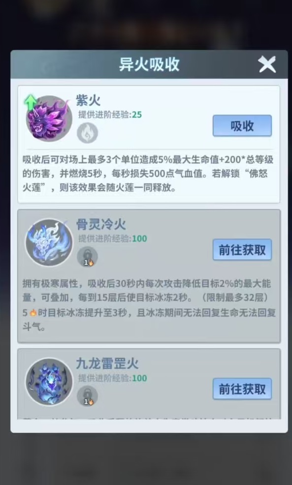 当前版本共设两大火种图谱:异火榜与兽火榜。前者收录如青莲地心火、骨灵冷火等原著标志性异火,具备高阶属性增幅与专属战斗效果;后者则包含紫火等过渡型火焰,侧重前期战力平滑过渡。每种火种均配备双重加成体系——基础属性增益(影响全角色面板)与技能特化强化(如紫火提升“狂狮之魄”技能伤害)。火种品级越高,两项加成幅度越显著,且可为《焚诀》提供更优质的进化素材。