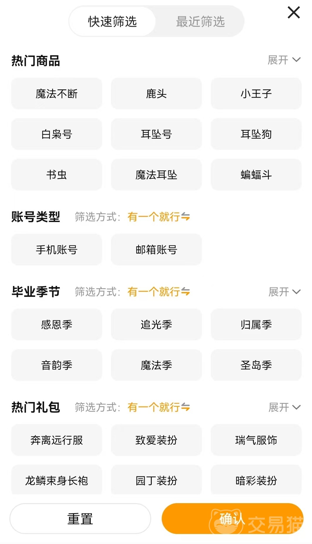 如果想要购买也是在首页中直接搜索专区,这里提供了详细筛选功能。包括账号所属的服务保障类型,例如是否具有账号转移,是否带有全额永久包赔,以及是否属于诚信卖等,还可以在这里筛选热门商品,例如毕业季节、热门礼包、毕业地图等,这些都可以帮助大家快速找到自己最心仪的号。面对茫茫多的商品,不用担心出现选择困难症,快速锁定后直接就能下单。发货过程也是由平台来发货,响应快到手快。