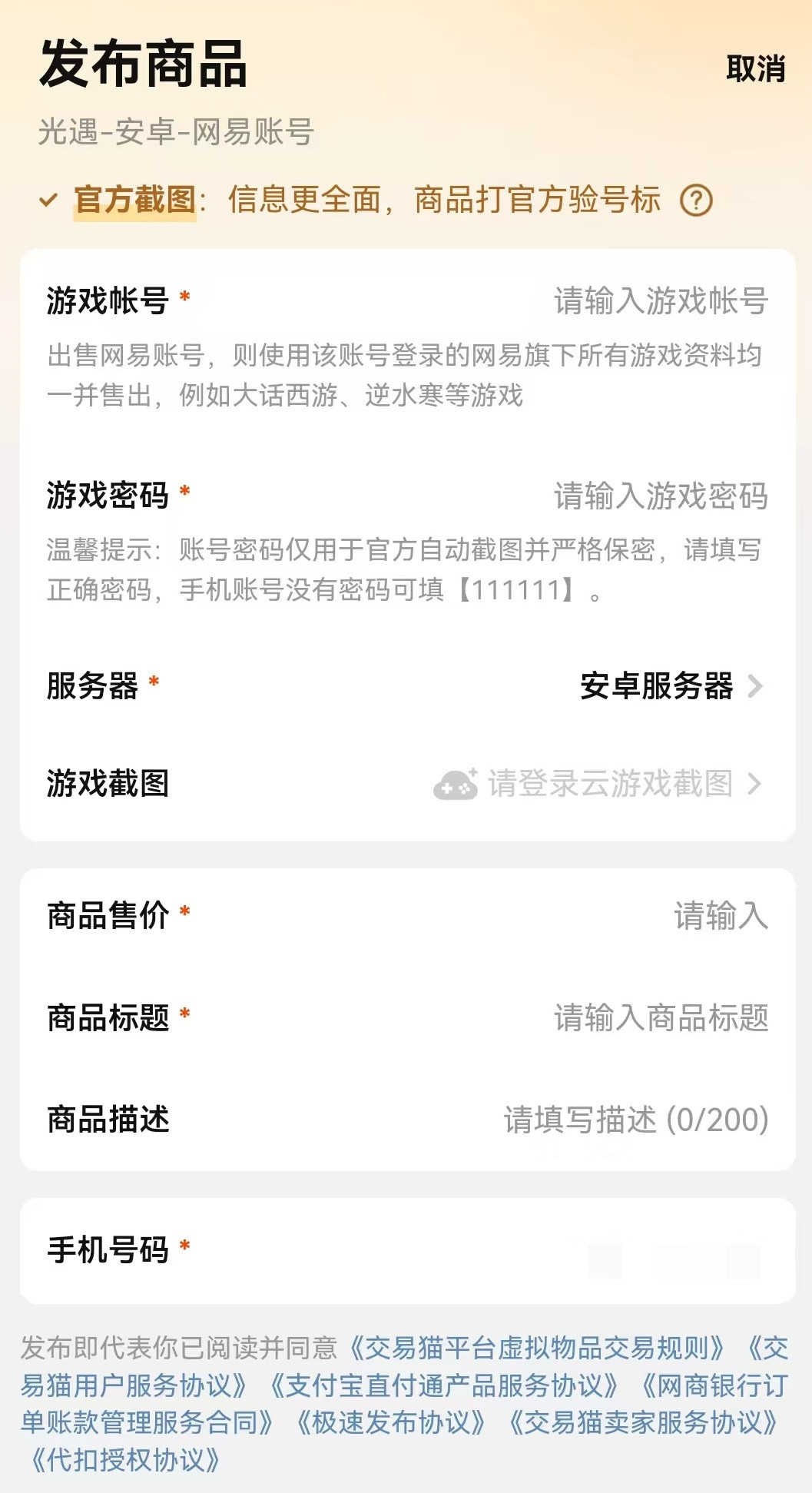 在出售的时候只需要选择好卖账号,然后在这里搜索到光遇的专区,接下来根据要求逐步点击,就可以到商品的发布页面。发布的时候采用的是官方截图,展示的信息全面,而且会打上官方验号的标签。接下来只需要输入自己的账号密码,所属服务器以及商品的售价和标题,简单进行描述,就能直接提交上架了。利用交易猫非常高的人气,短时间内就能有大量用户浏览,这样很快就能完成出售,出售完毕后1~3天内就能直接实现打款,收益有保障。