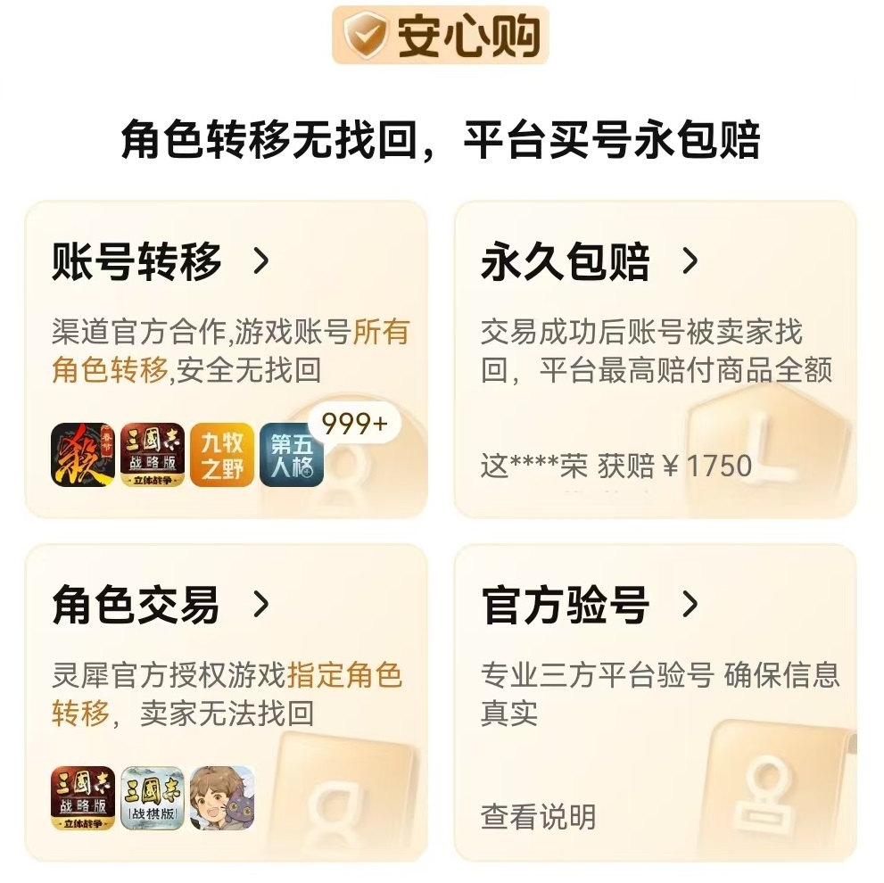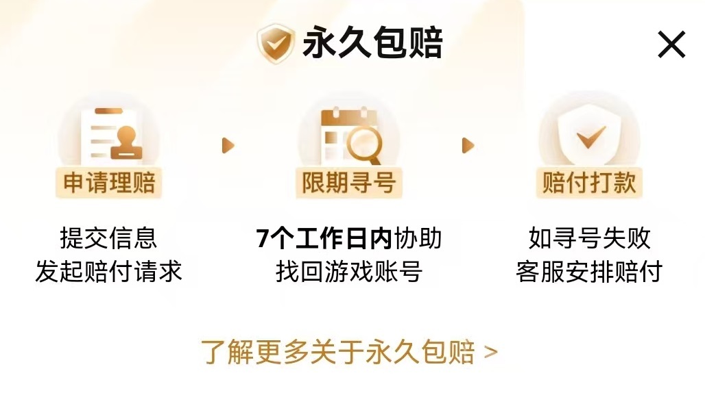 永久包赔指的是在交易猫中购买的账号只要交易成功后,账号出现被找回的情况,会优先追回账号,如果没有成功,则按承诺的比例进行赔付。这样一些价值比较高的号,就不用再担心出现人财两空的情况。所有成品号都享受到这一项服务,又分为30%包赔和全额包赔这两类,可以通过购买过程中的筛选功能,直接进行快速定位。另外30%包赔的商品还可以在下单时直接进行加购升级为全额包赔,这样更有保障。