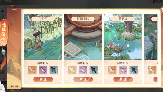 进入钓鱼功能需先打开左上角“玩法”菜单,定位至“闲暇”界面,点击其中的钓鱼入口即可开启。系统共提供多个风格迥异的鱼塘供选择——每处水域不仅拥有独立视觉场景,其生态构成亦各不相同:不同鱼塘对应可捕获的鱼类种类、稀有度及基础获取概率均存在差异。选定目标鱼塘后,点击“前往”传送至对应区域。抵达后,需与场景中固定位置的渔夫进行对话,完成初始交互后方可正式开始垂钓。
