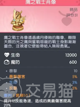 武器推荐提丰,该装备完美契合雅典娜天赋中“每次攻击造成目标最大生命值百分比伤害”的机制,并将单体伤害转化为范围效果,配合其闪避后吸血特性,可大幅提升团战中的血线维持效率。若暂未获取提丰,可选用具备生命属性加成的替代武器,确保天赋增益不被稀释。饰品方面,鹰之战士肖像为最优解,其提供急速属性加成与奥义伤害提升,进一步强化技能周转节奏与爆发上限。