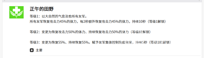 一技能【正午的田野】是克拉拉的基础群疗手段。释放后立即为全体友方单位恢复相当于她攻击力45%的生命值,并在后续10秒内每2秒额外恢复一次,形成多段治疗。该技能升至3级后,初始治疗量提升至攻击力的55%,且额外赋予全体队友10秒内免疫控制效果——此特性需角色达到181级方可解锁。