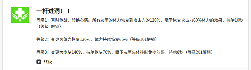 终极技能【一杆进洞】是克拉拉的大范围应急回复手段。释放后为全体友方恢复相当于攻击力120%的生命值,并维持10秒的持续治疗状态,适合在团战前或危急时刻作为先手使用,为后续输出或控制技能创造安全窗口。