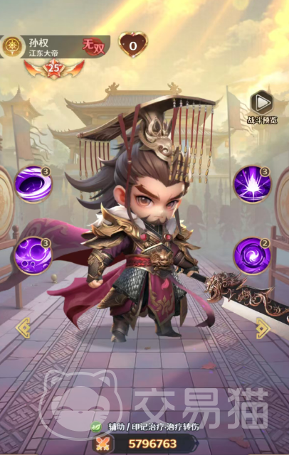 孙权:虽属无双系基础定位,但具备明确的六星成长路径。其核心机制围绕“精准治疗+动态防护”展开:主动技能可为己方生命比例最低的3名单位恢复等同于自身攻击134%的生命值,并为自己叠加1层【暗能印记】;该印记在孙权承伤时自动消耗,转而为当前血量最低的友方单位恢复50%攻击力的生命值,最多可叠加5层;此外有30%概率额外生成【庇护】,提供相当于孙权8%攻击力的护盾,形成“低血量优先响应+伤害转化防护”的双重保障体系。