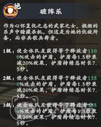 隐龙的神龙功可对范围内全体敌人造成93%攻击力的连续10段伤害,并附加持续6秒的嘲讽效果;该嘲讽具备动态衰减机制——我方每次命中目标,均可依据目标移动速度降低10%剩余持续时间,显著提升控场稳定性。桃姬则承担关键生存支撑职能:其破阵乐技能可为全体友方提供相当于自身1100%攻击力的护盾,该护盾每1.5秒衰减20%,总持续时长达7.5秒,为爆发窗口期提供坚实防护基础。