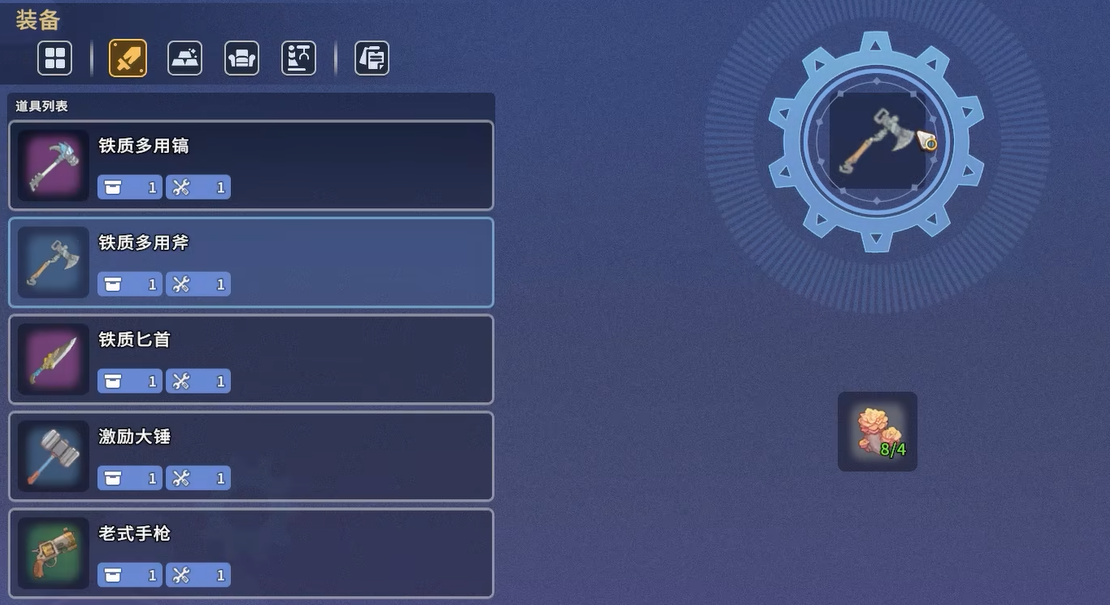 主角随后进入待接管的工坊。现场设施陈旧,仅一台基础制造台尚可运转。玩家需先掌握该设备操作逻辑,继而外出搜集木材、铁矿石与铜锭三类初始材料,合成首件工具——多功能镐。完成制作后返回商会向颜交付,随即获得废品回收机的设计图,任务目标升级为组装该设备。