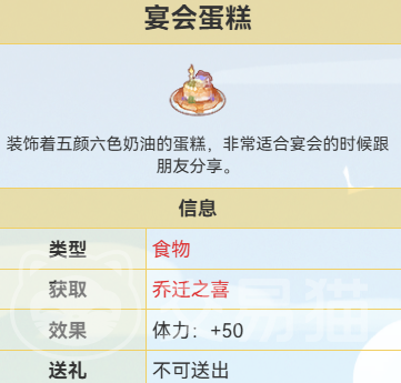 任务奖励为唯一道具——宴会蛋糕。外观呈现多层结构,表面覆盖缤纷奶油裱花,视觉辨识度高。游戏内图鉴描述强调其“适用于欢聚场合”,但机制设定明确限定:仅限玩家自身使用,不可赠予任何NPC。在礼物赠送界面中,该物品将被系统自动隐藏,无法用于提升角色好感度。