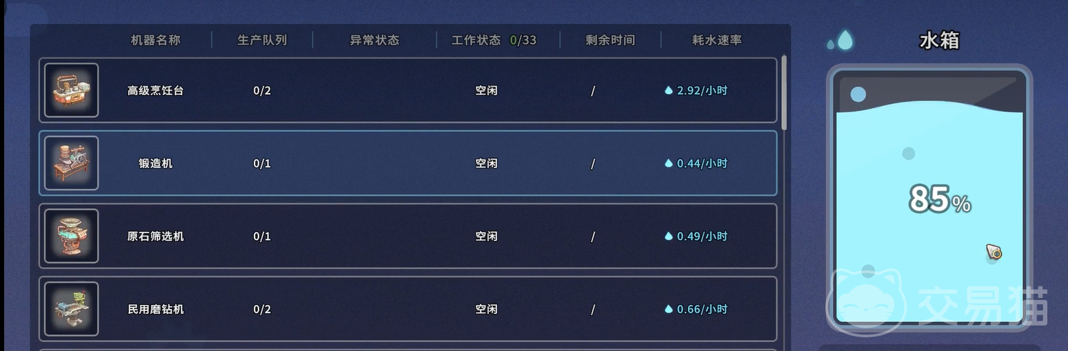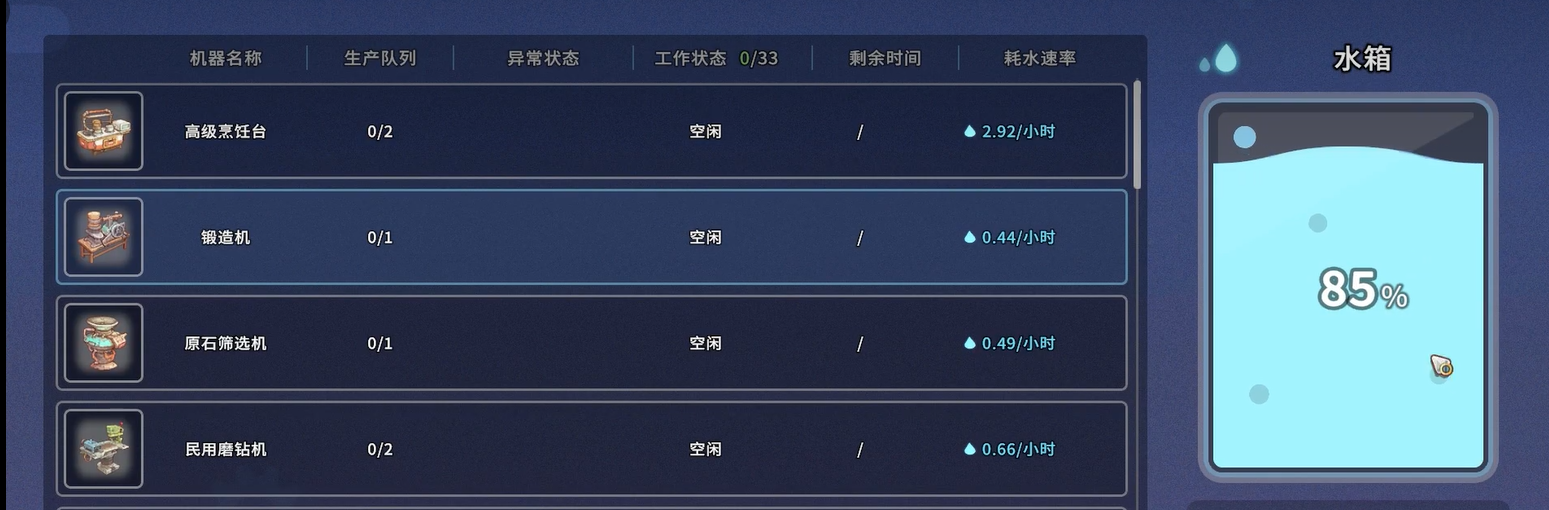 需注意,水箱具备明确容量上限,初始版本仅支持存储固定体积水量。界面中设有直观水位指示条,建议在玩家观察到水位降至三分之一以下时即启动补水流程。若放任水箱见底,将导致全工坊冷却中断,直接影响生产连续性与进度节奏。