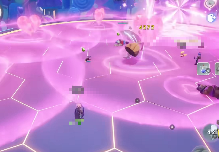 紧随其后的是全场控制技:粉红色爱心弹幕呈环状扩散,接触即触发2秒眩晕。此阶段严禁输出或使用非位移技能,所有成员需立即停止操作,优先向地图边缘横向移动规避。若已中招,应立刻使用解控类技能或等待队友协助驱散,确保不被后续AOE连锁击杀。