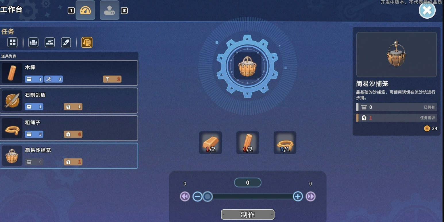 第一步是制作沙捕笼——这是开展所有沙捕活动的前提装备。玩家需前往工作台,在解锁对应配方后,消耗2个铜锭、2根木棒及1条粗绳子进行合成。铜锭可通过矿洞深层挖掘获得;木棒由基础木材加工制成;粗绳子则可在采集或任务奖励中稳定获取。材料齐备后,即可完成沙捕笼的制作。