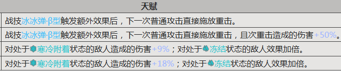 其核心技能“科技连击”构建了攻防一体的循环:普通攻击可触发额外效果,并使下一次普攻自动转为重击;升至二阶后,该重击伤害提升50%,显著强化单体瞬时输出能力。天赋“冰点”专精寒冷体系增益:一阶状态下,对已附着寒冷效果的目标提升9%伤害,若目标处于冻结状态,则增伤效果翻倍;二阶进一步将基础增伤提升至18%,使控场与输出形成高效协同。