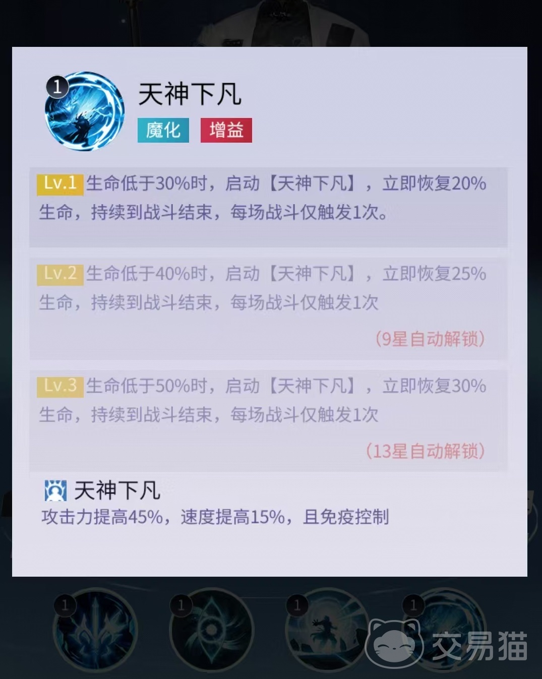 二技能具备双重增益逻辑:一方面随普攻次数累积提升伤害系数;另一方面在敌方释放控制类技能的瞬间自动触发追击响应。该技能同步强化角色三项核心属性——攻击力、最大生命值与暴击率,形成攻守兼备的成长路径。大招“天神下凡”为保命与反杀核心机制:当杨戬生命值降至30%以下时强制激活,立即恢复大量生命,并进入持续性天神状态。此状态下,角色获得攻击力与行动速度的显著提升,同时完全免疫所有控制效果。该特性使其在高压控场环境中具备极强的生存韧性与反打能力,适合作为主力输出位应对多控阵容。