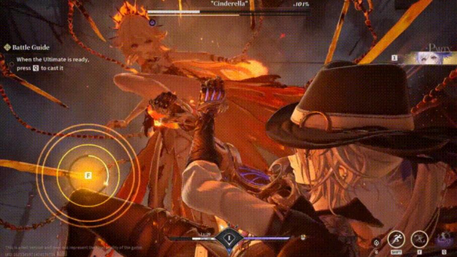 战斗初始阶段,灰姑娘将驾驭火焰战马强势入场,此时需重点应对两类威胁:一是高速直线冲锋,二是覆盖扇形区域的火焰喷射。开战瞬间地面浮现两道同心光圈,为关键预警信号——此阶段所有火焰视觉效果均为演出动画,不造成实际伤害,玩家可借此窗口迅速贴近并展开稳定输出,无需盲目后撤。