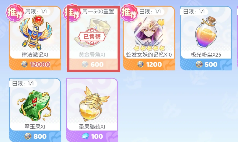 神器商店实行分级采购机制。黄金号角为每周固定刚需,必须确保全额购入。极光粉尘建议每日采购,但若当前神器进阶进度较缓,或已通过副本/符石系统稳定获取,则可动态下调数量。贤者之石与所罗门之戒属于通用型强化道具,可根据实际神器装配缺口灵活补充。