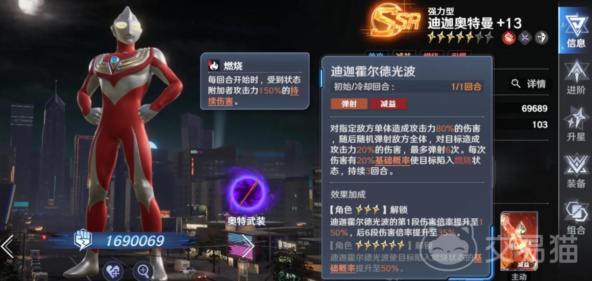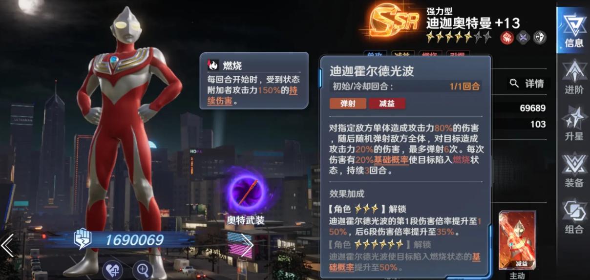 强力迪迦奥特曼——燃烧流体系核心,小技能施加群体灼烧(灼烧伤害本身即含150%群体倍率),大招专注单体爆发,持续伤害与瞬时斩杀能力兼备,在多场景下输出稳定性突出。