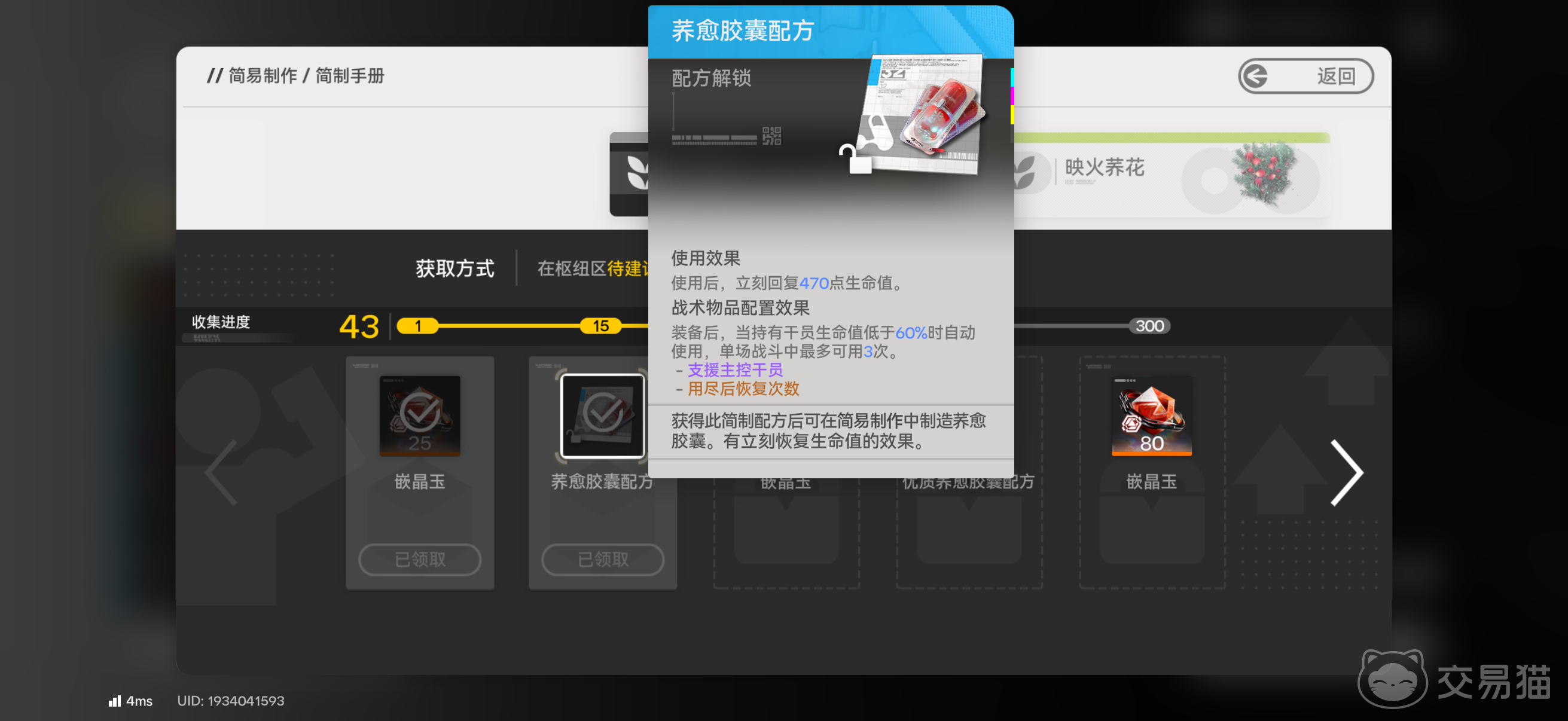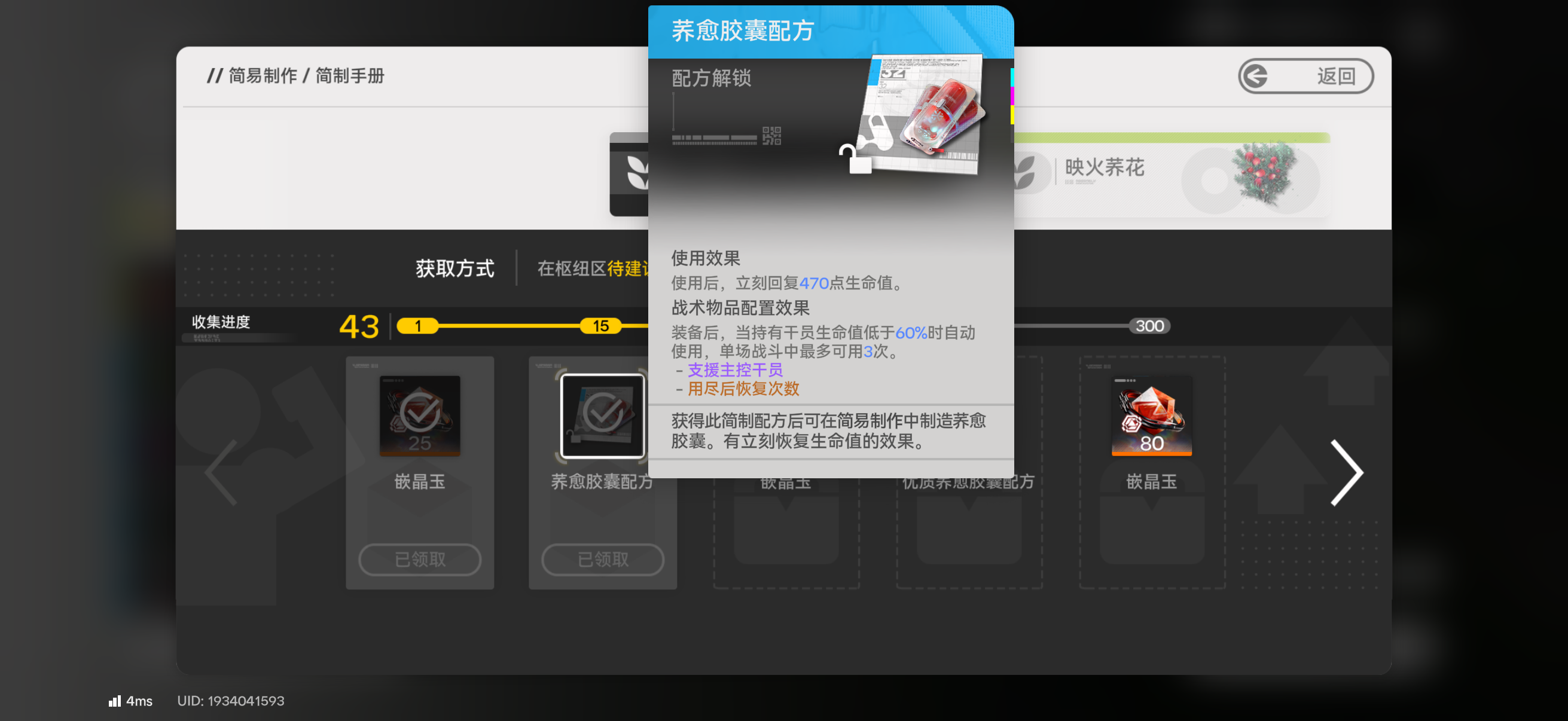 荞愈胶囊的制作前提是解锁对应配方。该配方需通过采集荞花触发——当玩家累计采集荞花达指定数量后,系统将自动解锁该道具的合成逻辑。配方解锁后,即可进入具体制作流程。