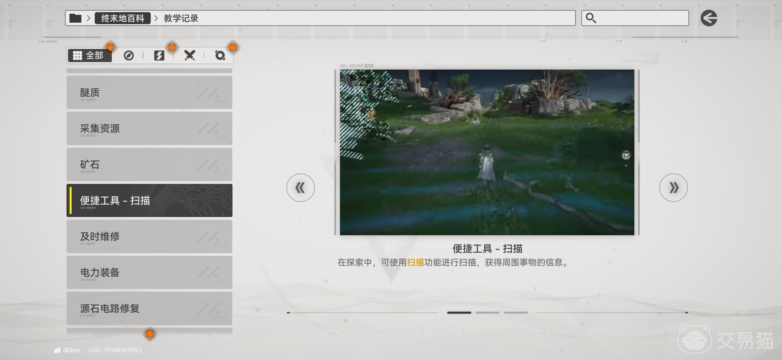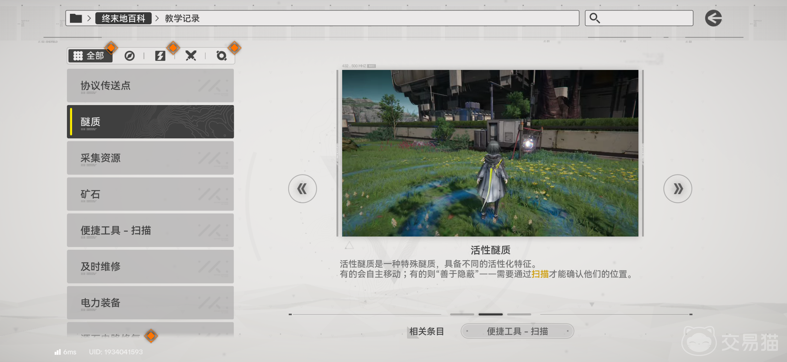 1、启用内置“扫描”功能。该机制可高亮显示范围内所有可交互目标,包括常规采集物及隐匿型活性醚质。部分醚质因环境融合度高或处于视角盲区,仅依赖目视极难识别,必须通过主动扫描触发其轮廓提示。